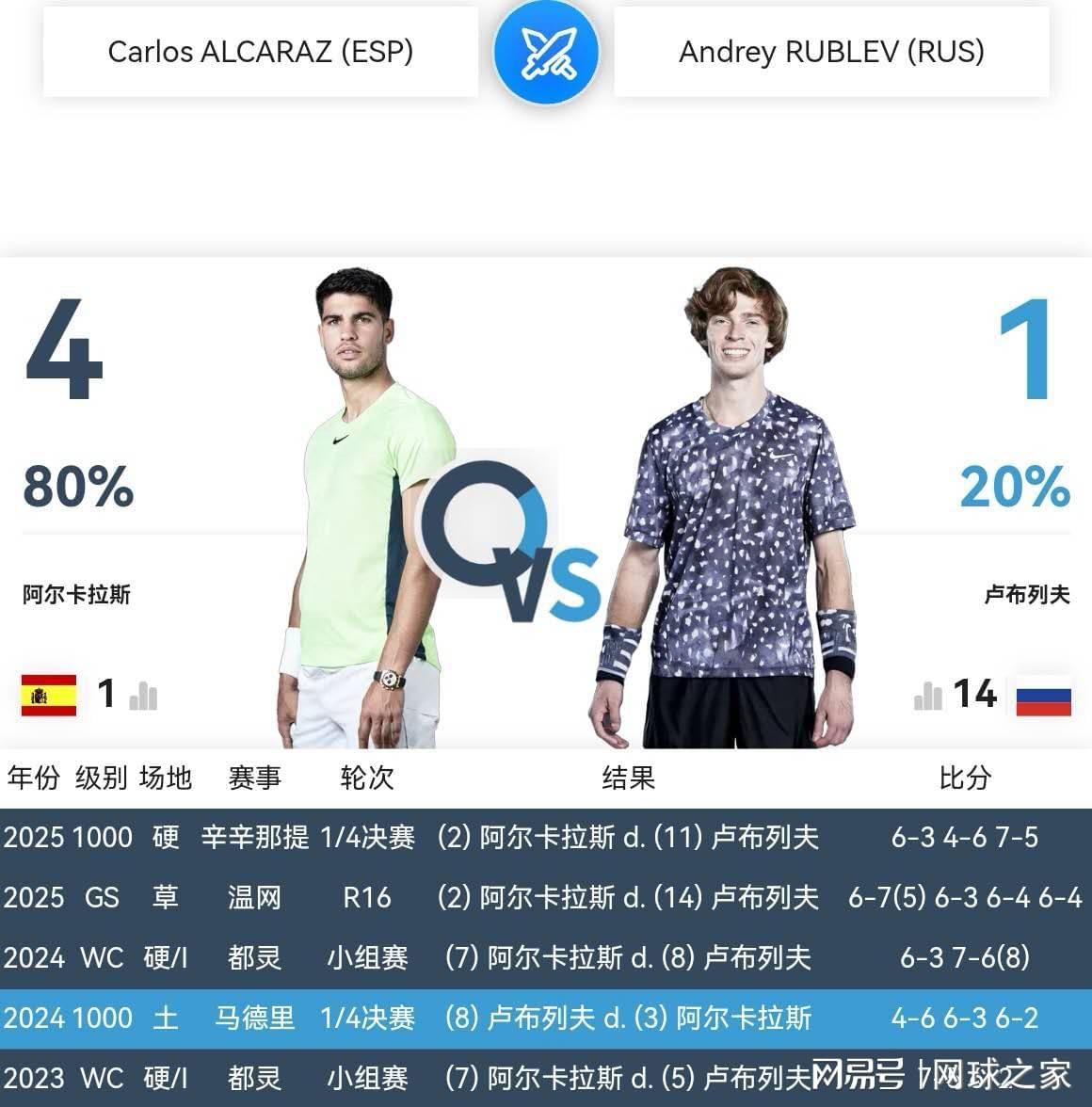 好不容易今天凌晨1/4决赛送走了2024年赛会冠军、俄罗斯雷神卡恰诺夫,明天凌晨零点半开始的半决赛,阿尔卡拉斯又迎来了卫冕冠军、俄罗斯金丝猴卢布列夫的挑战,难度更加升级,竞争更加激烈。